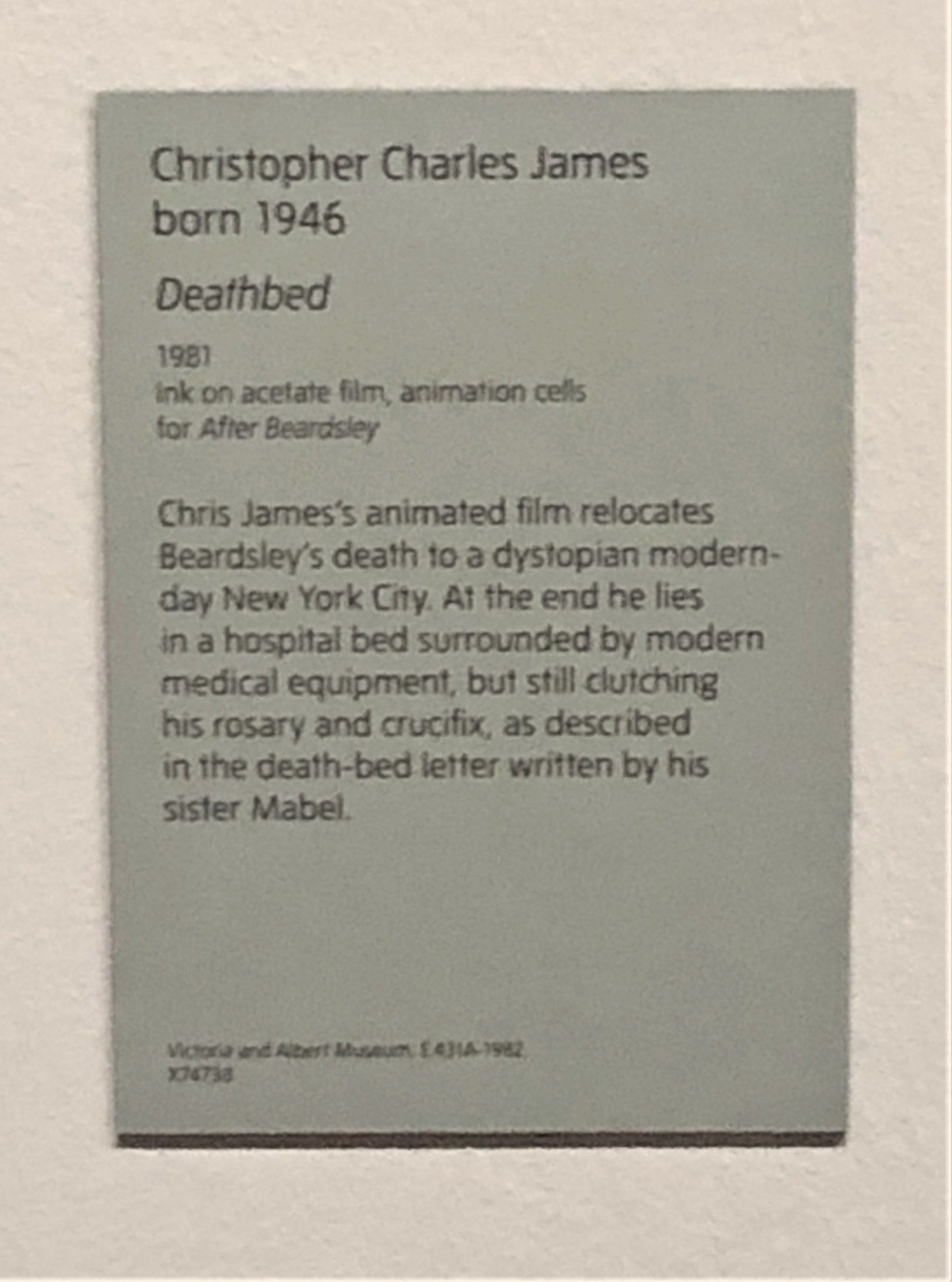 In March of 2020 a new Aubrey Beardsley exhibition opened at Tate Britain. The co-curator of the exhibition, Stephen Calloway, thought that a cell from my film, After Beardsley, purchased by The Victoria & Albert Museum in 1998, would make an appropriate inclusion in the exhibition. It shows Aubrey Beardsley on his deathbed in a modern hospital setting and was the final image in the exhibition.